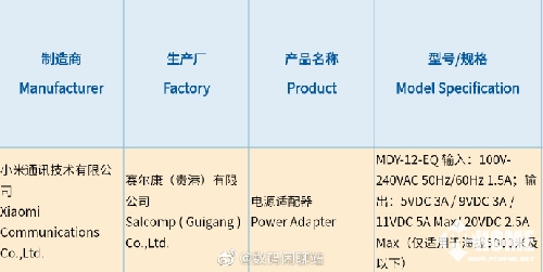 - Según el sitio web nacional de certificación 3C, el nuevo cargador Xiaomi ha pasado la certificación 3C. La información muestra que este cargador admite un protocolo de carga rápida de hasta 55 W (11 V 5 A), el modelo es MDY-12-EQ y la primera fecha de certificación es el 23 de noviembre. Japón, el fabricante es Xiaomi Communication Technology Co., Ltd., y la planta de producción es Salcom (Guigang) Co., Ltd.
